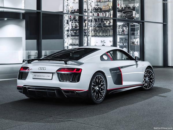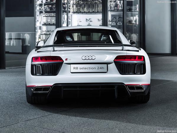 آئودی از R8 V10 Plus Selection 24h تنها ۲۴ عدد آنهم فقط برای بازار آلمان خواهد ساخت. موتور v10 این خودرو با ۵.۲ لیتر حجم توانایی تولید ۶۱۰ اسب بخار قدرت را دارد. این پیشرانه به محصول جدید آئودی این امکان را میدهد تا در مدت زمان ۳.۲ ثانیه از شتاب صفر به ۱۰۰ کیلومتر بر ساعت برسد و حداکثر سرعتی برابر با ۳۳۰ کیلومتر بر ساعت را داشته باشد. آئودی R8 جدید وزنی معادل با 1,454 کیلوگرم دارد، این وزن مناسب نتیجه به کارگیری ترکیبی از آلومینیوم و الیافکربن پلیمر تقویت شده است. در این مدل مخصوص، جزئیاتی مانند پوشش روی موتور، بال عقب خودرو و دیفیوزر نصب شده زیر سپر عقب، از فایبر کربن براق ساخته شدهاند. لوگوی R8 24h نیز بر روی پنلهای کناری فایبرکربنی دو طرف اتومبیل که جلوی چرخهای عقبی نصب شده، چسبانده شدهاند تا تفاوت ظاهری این مدل مشخصتر باشد.