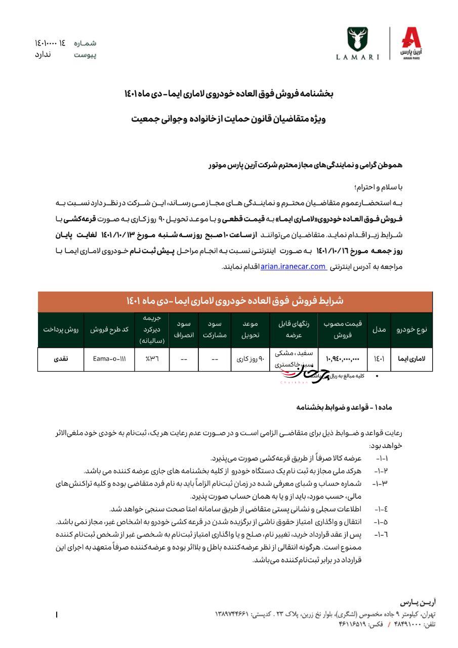 شرکت آرین پارس موتور به تازگی شرایط فروش فوقالعاده خودرو لاماری ایما را اعلام کرد. این طرح از فروش که ویژه متقاضیان قانون حمایت از خانواده و جوانی جمعیت است، از ساعت 10 صبح روز سه شنبه مورخ 13 دی لغایت 16 دیماه 1401 به صورت ثبت درخواست و سپس قرعهکشی برگزار خواهد شد.