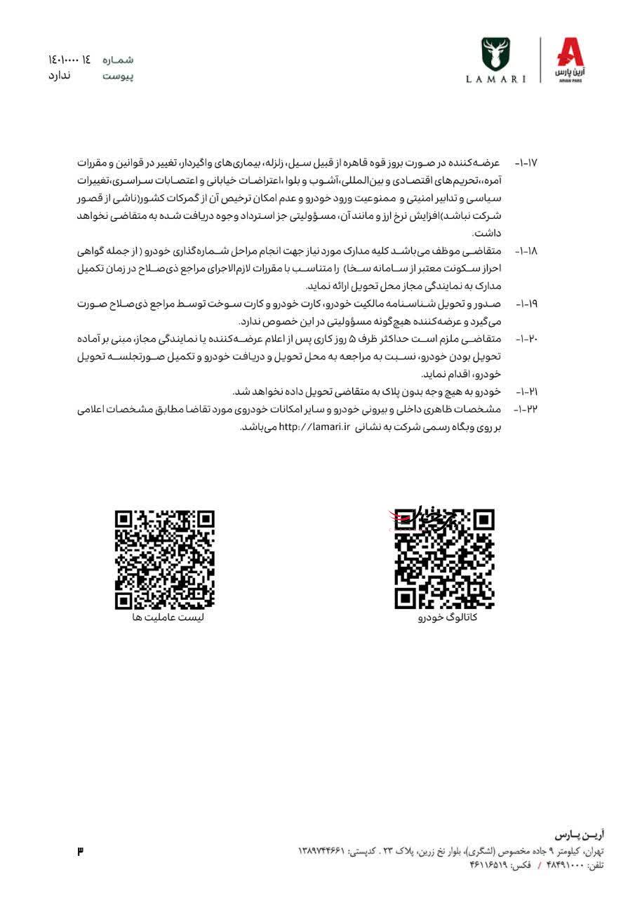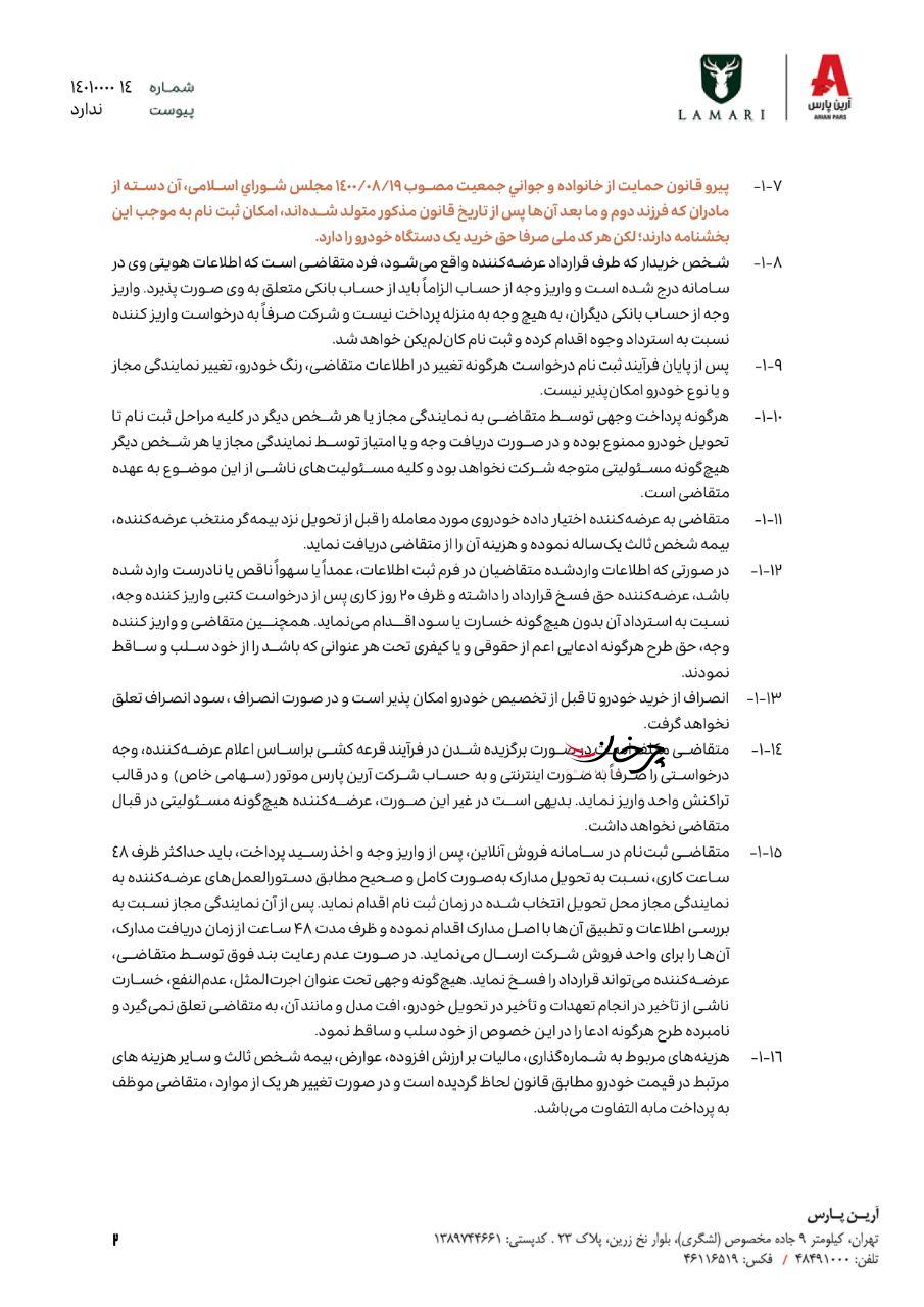در این طرح فروش، خبری از سود مشارکت و سود انصراف نیست. البته جریمه دیرکرد تحویل خودرو، به صورت 36 درصد سالیانه یا 3 درصد ماهیانه از سوی آرین پارس موتور در نظر گرفته شده است. موعد تحویل این خودرو 90 روز کاری اعلام شده و افراد برنده، باید کل بهای خودرو را در هنگام ثبتنام به حساب شرکت واریز نمایند.