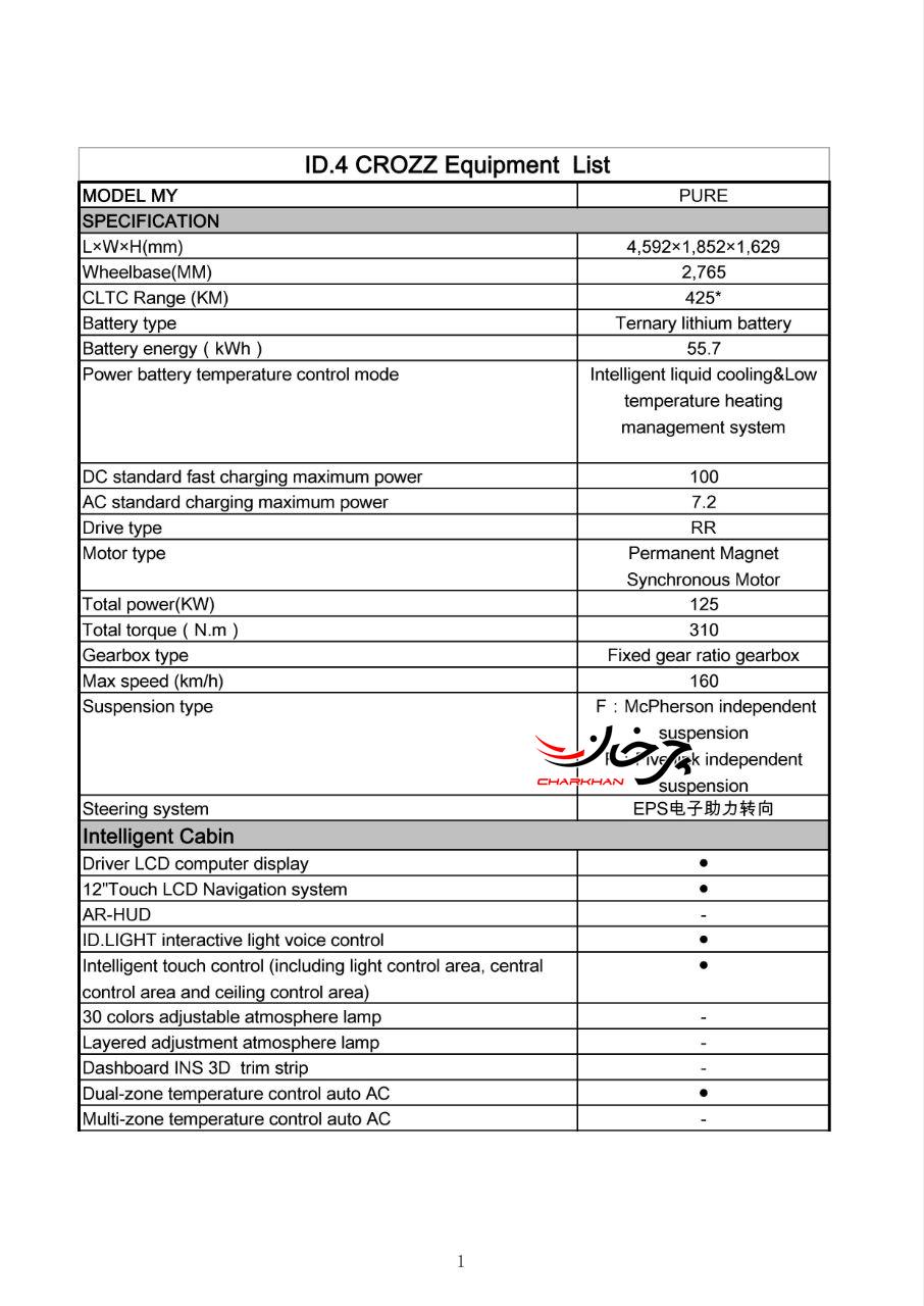 خوشبختانه علاوه بر اطلاعات فوق، بروشور اطلاعات این خودرو هم بدست خبرنگار پایگاه خبری چرخان رسیده که در ادامه میتوانید مشاهده کنید. لازم به ذکر است که هنوز به صورت رسمی مشخص نیست که متولی واردات فولکس واگن ID.4 CROZZ مونتاژ چین، چه شرکتی خواهد بود! اما باتوجه به تولید این خودرو توسط گروه FAW در چین، واردات آن توسط بهمن موتور و یا همان BM CARS، بالاست.