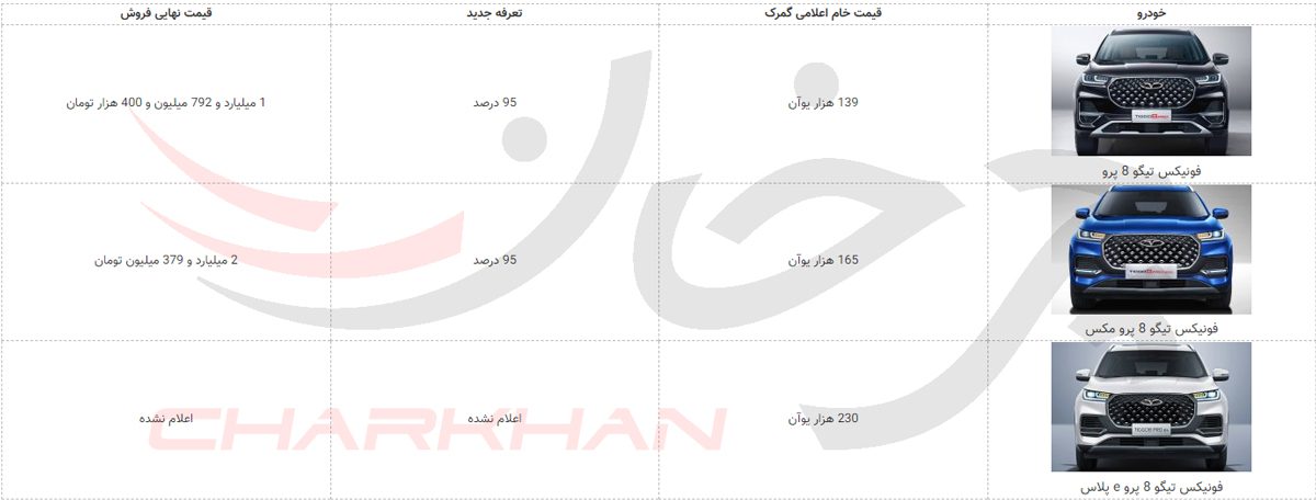 اما به تازگی، شرکت مدیران خودرو نسخه پلاگین هیبرید تیگو 8 پرو را هم با عنوان فونیکس تیگو 8 پرو e پلاس به بازار ایران معرفی کرده است. براساس اطلاعات دریافتی از منابع گمرکی، این تیپ از تیگو 8، قیمت خام بیشتری از تیگو 8 پرو مکس دارد. البته باتوجه به اینکه تعرفه واردات قطعات خودروهای هیبریدی کمتر از خودروهای بنزینی است، می توان تا حدی امیدوار بود که فاصله قیمتی تیگو 8 پرو e پلاس با تیگو 8 پرو مکس زیاد نباشد. البته این یک احتمال است!