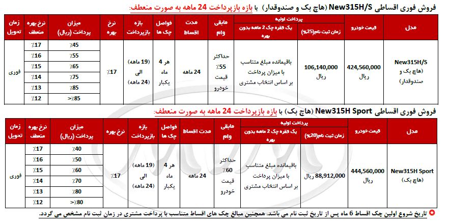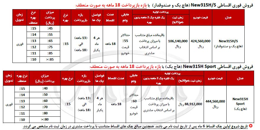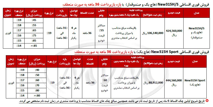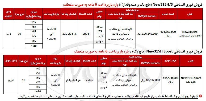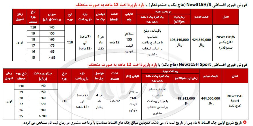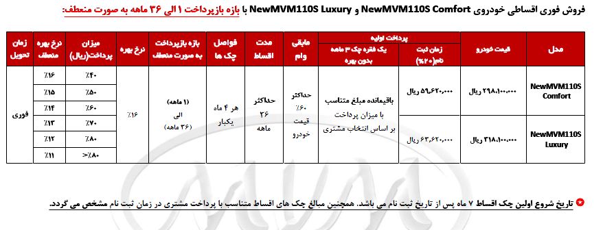 مدیران خودرو در اطلاعیهای شرایط فروش ویژه محصولات خود را اعلام کرد. بر همین اساس محصول امویام 110 در دو مدل Comfort و Luxury با قیمت نقدی 298 میلیون و 100 هزار ریال و 318 میلیون و 100 هزار ریال به فروش گذاشته شده است و خریداران میتوانند این محصولات را با شرایط فروش اقساطی و با پرداخت 20 درصد قیمت نقدی و 20 درصد را بصورت یک فقره چک و مابقی را با وام 12 تا 36 ماهه خریداری کنند. همچنین محصول 315 هاچ بک و صندوقدار با قیمت 424 میلیون ریال با شرایط مشابه و با اقساط ۶ الی ۳۶ ماهه عرضه خواهد شد. شما علاقهمندان میتوانید برای کسب اطلاعات بیشتر به نمایندگی های مجاز مدیران خودرو مراجعه فرمایید.