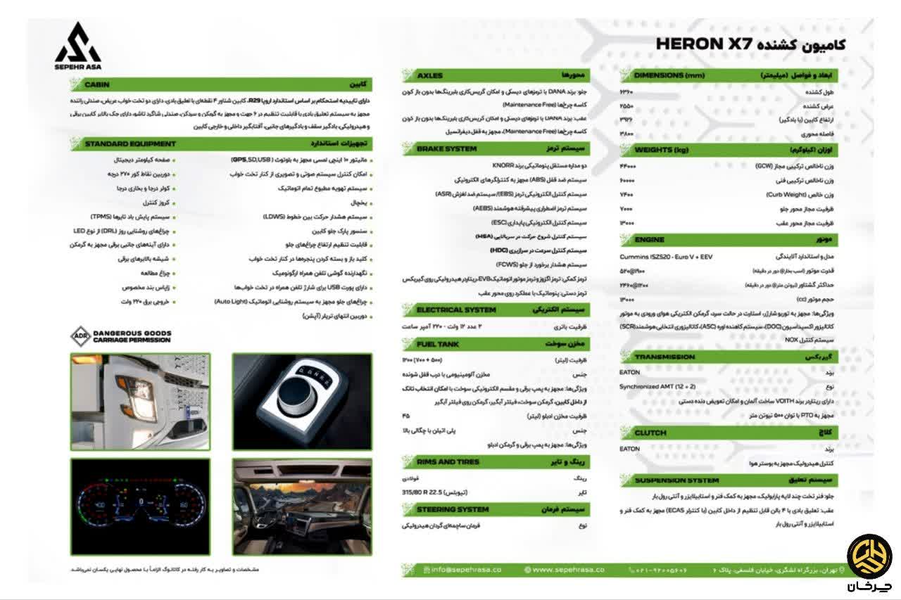 همزمان با رونمایی کشنده هرون X7، سپهر آسا دیزل در وبسایت خود، کاتالوگ و مشخصات آن را منتشر کرد. با ما همراه باشید تا نگاه مختصری به مشخصات جدیدترین کشنده بازار ایران بیندازیم.