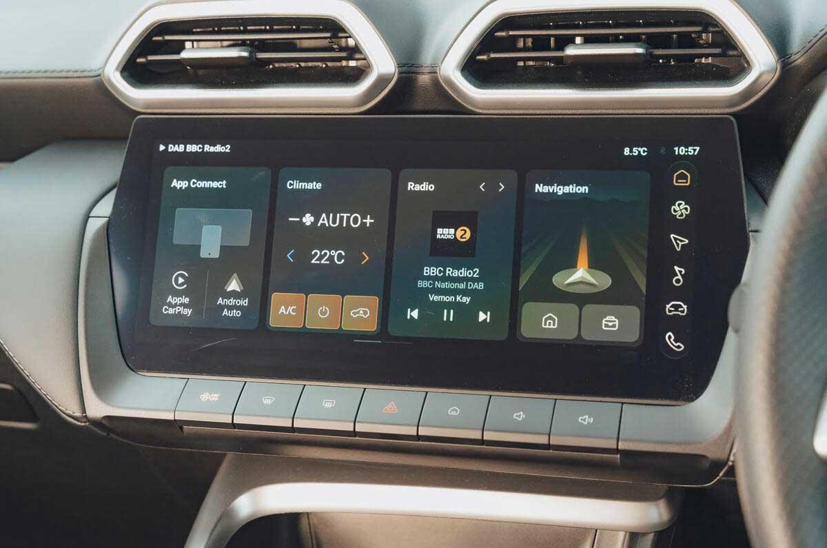 داخل کابین MG ZS جدید، فضای کافی برای سرنشینان وجود دارد و کیفیت مواد استفادهشده بهبود یافته است. صندلیهای جلویی راحت و با قابلیت تنظیم ارتفاع هستند، اما در برخی موارد، تنظیمات اضافی مانند زاویه یا افزایش طول صندلیها وجود ندارد. صفحه نمایش لمسی 12.3 اینچی به همراه نمایشگر دیجیتال برای ابزارهای کنترلی، تجربه کاربری مدرنی را فراهم میآورد.