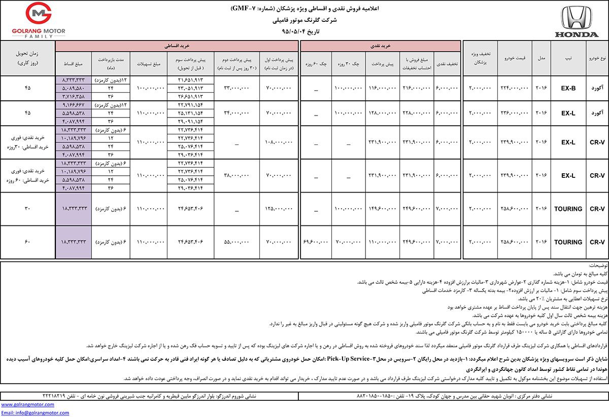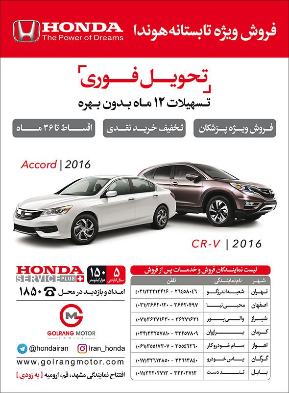 شرکت گلرنگ خودرو فروش ویژه محصولات هوندا را آغاز نموده است. شرکت گلرنگ موتور فامیلی نماینده فروش و خدمات پس از فروش خودروهای سواری با برند تجاری هوندا در ایران است که از سال ۱۳۹۴ فعالیت رسمی خود را آغاز کرده است. بر اساس همین شرایط فروش، مدل ۲۰۱۶ خودروهای آکورد و CR-V با شرایط ویژه و اقساط ۱۲ الی ۳۶ ماه ويژه پزشکان عرضه خواهد شد. برای کسب اطلاعات بیشتر میتوانید به سایت این شرکت مراجعه فرمایید.