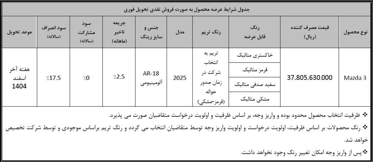 امکان ثبتنام بهصورت نقدی با قیمت قطعی و تحویل فوری خودروی مزدا 3 گروه بهمن از محصولات وارداتی BM CARS با ظرفیت محدود، بهصورت آنلاین از ساعت 10 صبح روز دوشنبه مورخ 13/11/1404 لغایت ساعت 16 همان روز یا تا زمان تکمیل ظرفیت به شرح جدول ذیل فراهم میگردد.