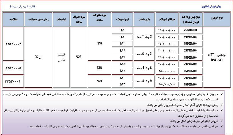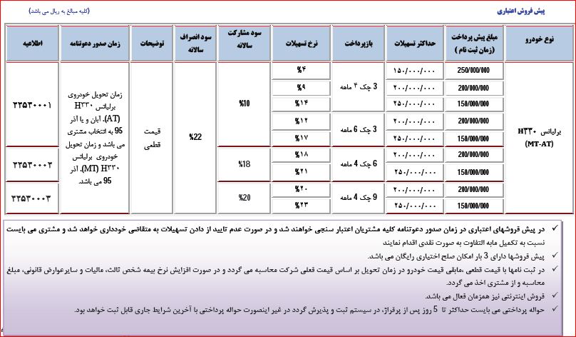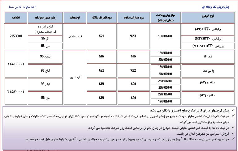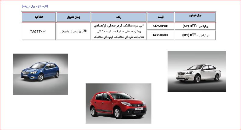 گروه خودروسازی سایپا، شرایط فروش ویژه محصولات پارسخودرو را اعلام کرد و براساس همین بخشنامه فروش ویژه این شرکت از تاریخ ۱ یکم شهریورماه آغاز شده است. در این شرایط فروش خودروهای برلیانس H330 اتوماتیک با قیمت ۵۴.۲۲۰.۰۰۰ تومان و برلیانس H330 دستی با قیمت ۴۴.۳۸۰.۰۰۰ تومان با موعد تحویل ۳۰ روزه، عرضه خواهد شد. همچنین خریداران میتوانند اکثر خودروهای این شرکت را بهصورت اقساطی خریداری کنند. برای کسب اطلاعات بیشتر به نمایندگیهای پارس خودرو مراجعه فرمایید.