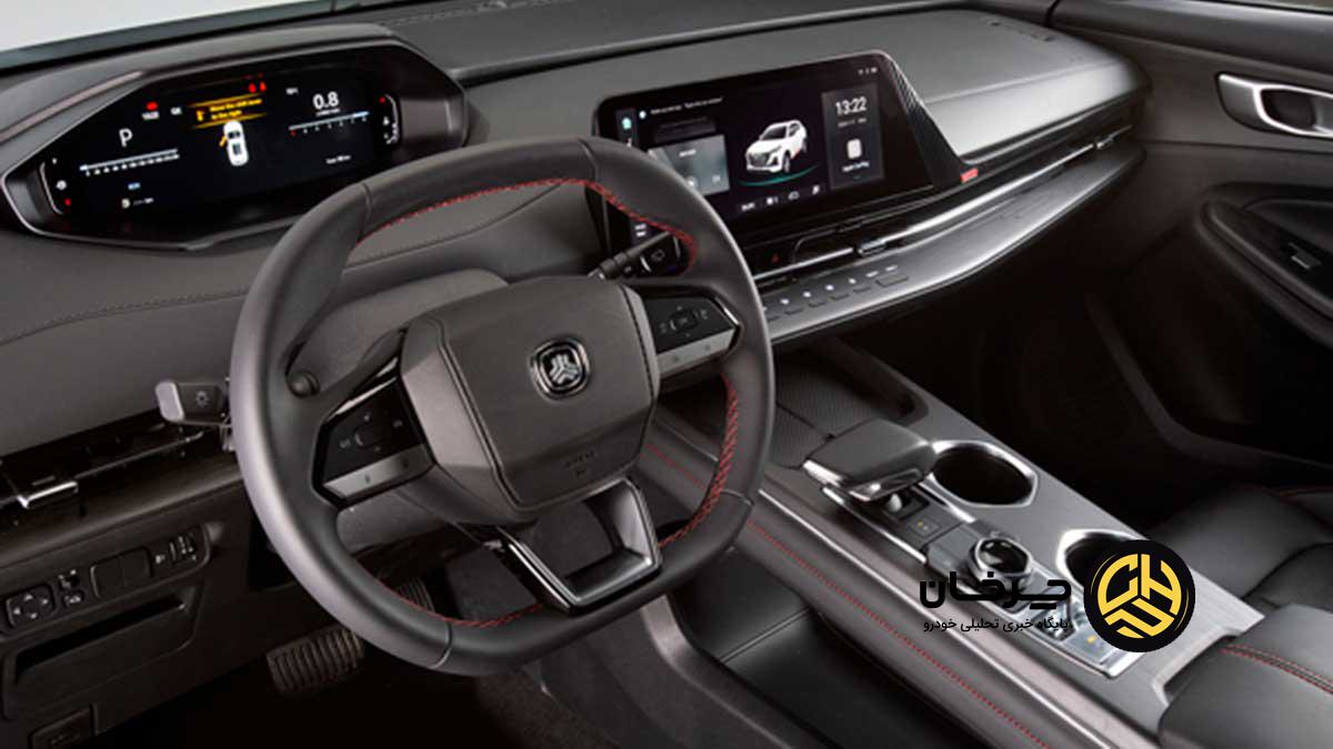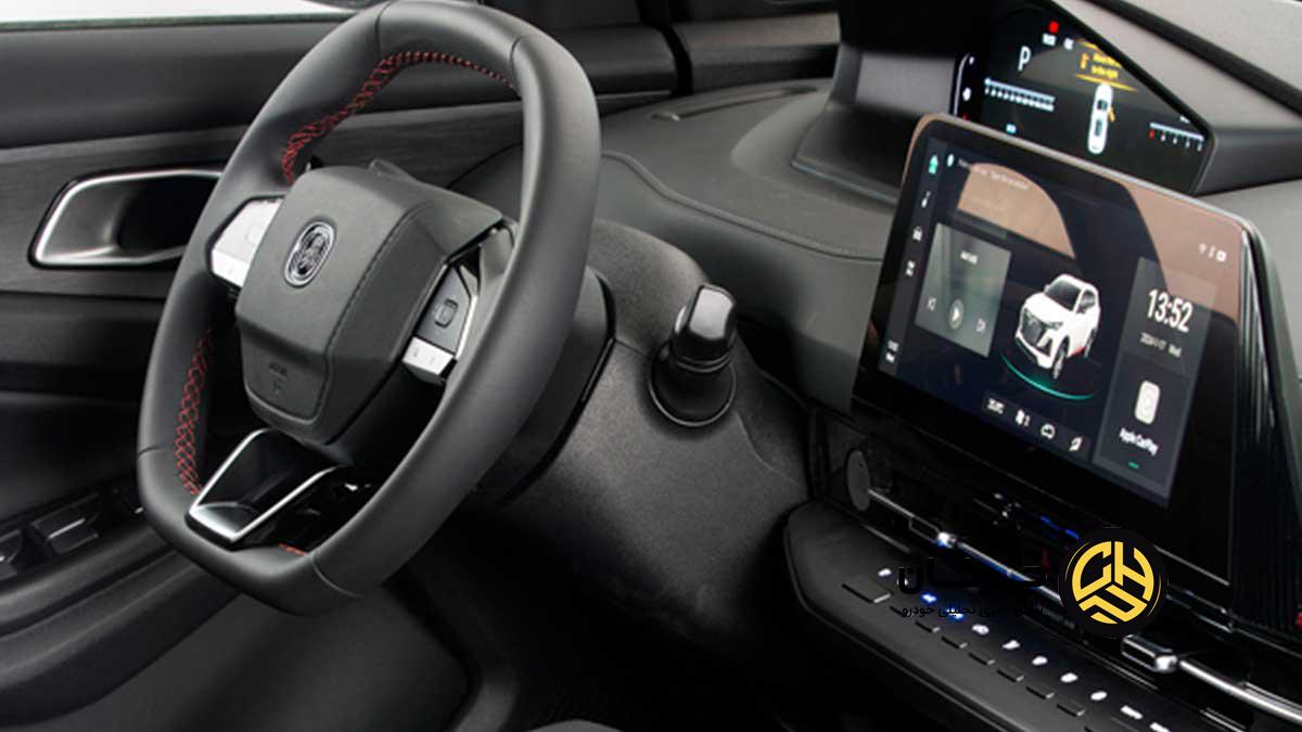 CS55 پلاس در داخل نیز فضای جذاب و منحصربهفردی دارد. در اینجا غربیلک فرمان مربعی کوچک که در ارتفاع نسبتاً پایینتری قرار گرفته و صفحه آمپر دیجیتالی با قاب هشتضلعی از بالای آن دیده میشود، بهوضوح از محصولات پژو الهام گرفته است. در میانه داشبورد هم یک نمایشگر 10 اینچی اطلاعاتی-سرگرمی خودنمایی میکند که از زیر آن دریچههای تهویه با طرح سراسری کشیده شدهاند. این سبک طراحی هرچند از پژو الهام گرفته اما فضای منحصربهفردی به کابین CS55 پلاس بخشیده که مشابه آن را در دیگر خودروهای چینی بازار نمیبینیم. طراحی لوکس کنسول مرکزی با دو جا لیوانی و تریم دورنگ هم از دیگر ویژگیهای داخلی این شاسیبلند چینی هستند.
