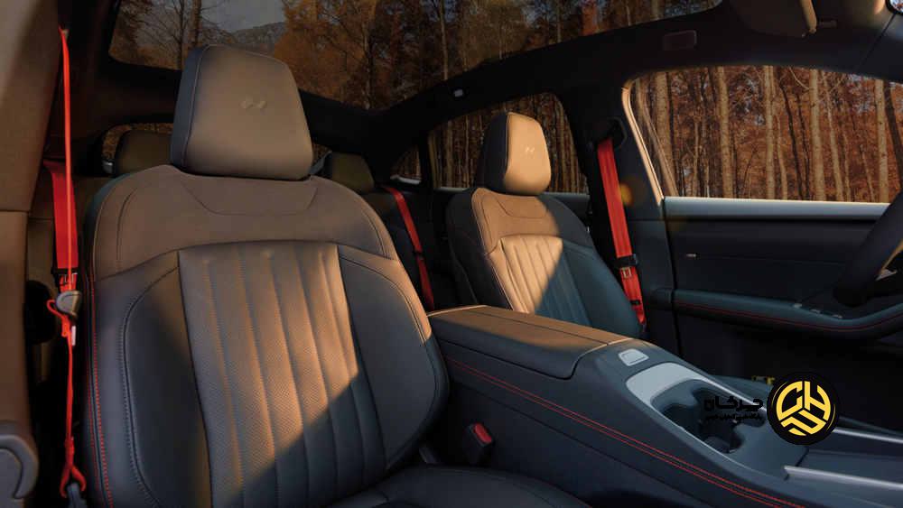در کابین، تودوزی مشکی، دوخت نارنجی و کمربندهای ایمنی نارنجی رنگ توجهمان را به خود جلب کردند. میز تاشویی برای سرنشین سمت راست در عقب در نظر گرفته شده است.