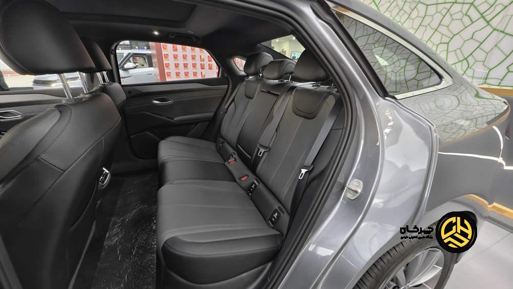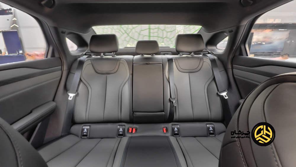 کیفیت مواد داخلی به کار رفته بالاست و صندلیها و تریمها با چرم و مواد نرم پوشیده شدهاند تا حس لوکس بودن را منتقل کنند. صندلیهای جلو راحت و خوشفرم هستند و تجربهای عالی از رانندگی ارائه میدهند. در بخش عقب، فضای کافی فراهم شده و فضای پا هم گسترده است.