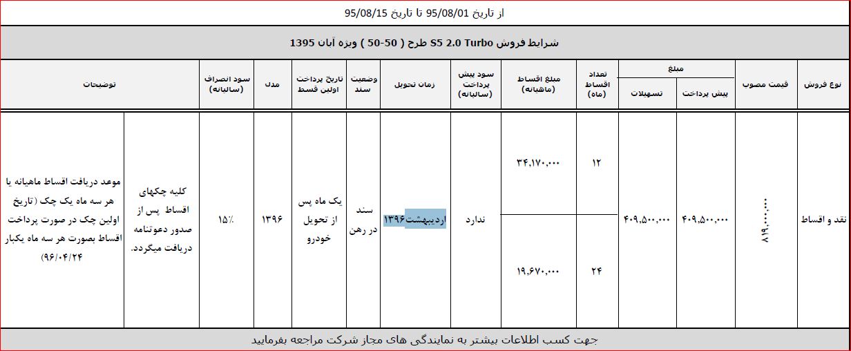 کرمانخودرو بهعنوان نمایندگی رسمی محصولات جک چین در ایران، شرایط فروش ویژه جک اس ۵ را با اقساط ۱۲ و ۲۴ ماهه منتشر کرد. قیمت مصوب این محصول 819,000,000 ریال اعلام شده و خریداران میتوانند با پیشپرداخت 409,500,000 ریال و زمان تحویل ارديبهشت 1396، این خودرو را خریداری کنند. برای کسب اطلاعات بیشتر میتوانید به نمایندگیهای ایرانخودرو مراجعه کنید.