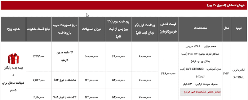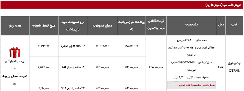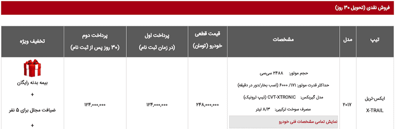 قیمت نیسان ایکس تریل مدل ۲۰۱۷ معادل ۲۴۸ میلیون تومان تعیین شده که در خریدهای نقدی، بیمه بدنه رایگان، ضیافت مجلل برای ۵ نفر و ۳ سال سرویس رایگان ارائه میشود. در خریدهای اقساطی مشتریان میتوانند با گرفتن تسهیلات ۱۴ ماهه بدون کارمزد، ۱۸ ماهه با نرخ ۱۲ درصد یا ۲۴ ماهه با نرخ ۱۸ درصد خودرویشان را خریداری کنند. شرکت جهان نوین آریا برای شرایط اقساطی تنها بیمه بدنه رایگان و ضیافت مجلل را ارائه خواهد کرد.